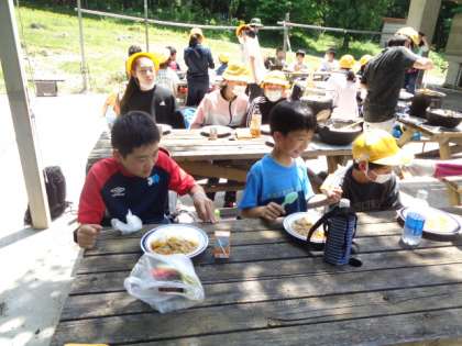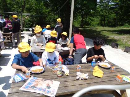 4つの班の個性が出たカレーが出来上がり、子供たちはおいしくいただきました。