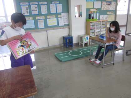 朝の会の後、読み聞かせを行っています。今日選んだ本は、「わらいのひみつ」です。お話に集中し、読み終わるとすぐに、感想を話す姿がすてきです。