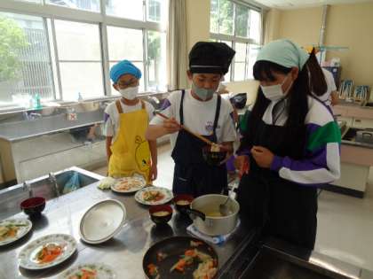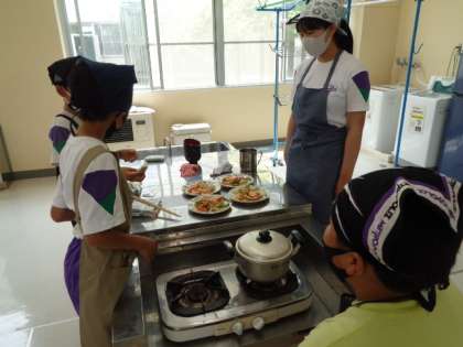 家庭科で調理実習に取り組んでいました。宿泊学習の野外炊爨の経験が生かされていましたね。