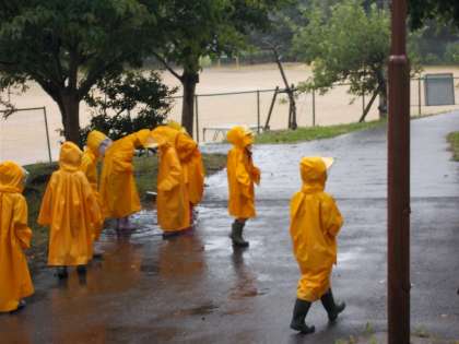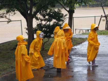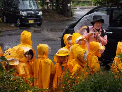 雨が降って大喜びの1年生たち。「紫陽花だ!うちにも紫陽花があるよ。」「かたつむり、いないかな。」「水たまりだ!入ろう!」と、見付けたことや感じたことを楽しそうに伝え合っていました。