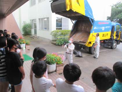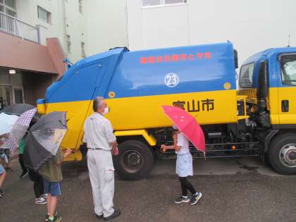 初めに海洋ごみの話を聞いたり、実際のリサイクル製品を見たりしました。その後、収集車の動く様子を近くで見させてもらいました。子供たちは、富山市のごみ処理について理解を深めていました。