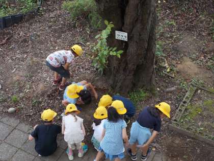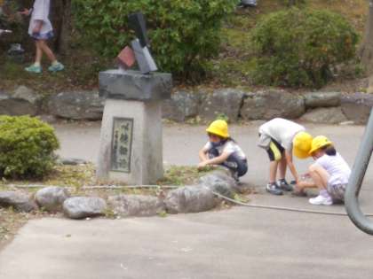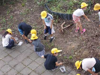 ダンゴムシを探す子供たち。とても楽しそうです。見付けたダンゴムシは、班ごとに飼育します。