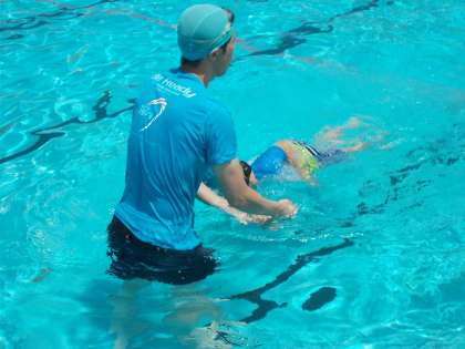 (上)クロールのポイントを教えてもらっています。