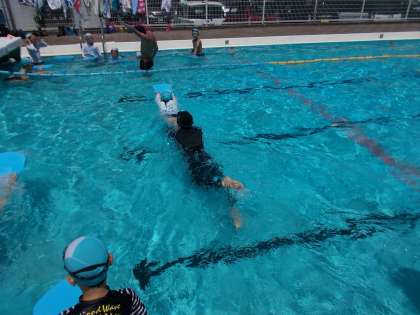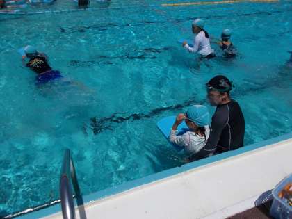 (下)ビート板を使って、蹴伸びの練習をしています。