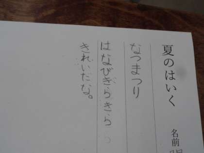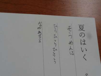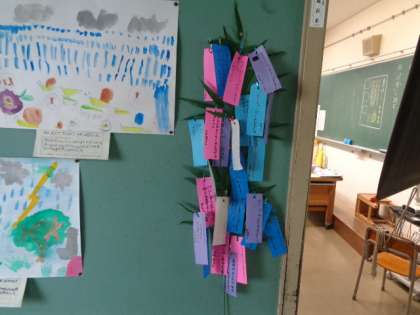 国語科で夏の俳句を作っていました。廊下に出ると、目についたのは七夕飾り。教室の中も外も夏模様でした。