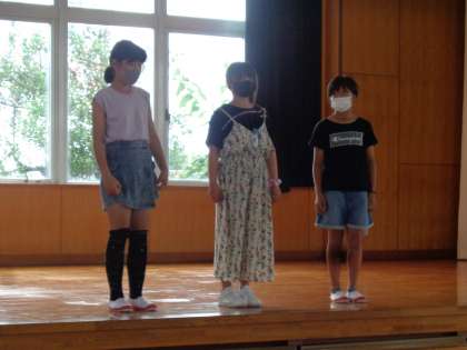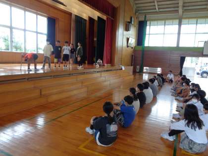 5年生の絆を深めることをめあてに、3つの班に分かれて、好きな漫画のストーリーを劇で表現しました。6年生に見てもらいました。