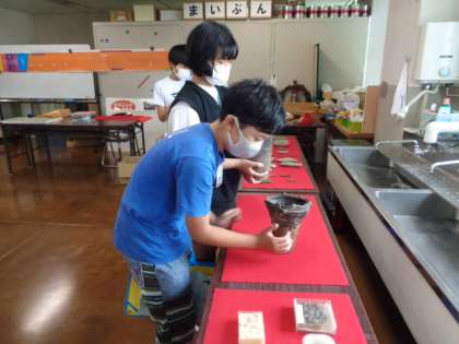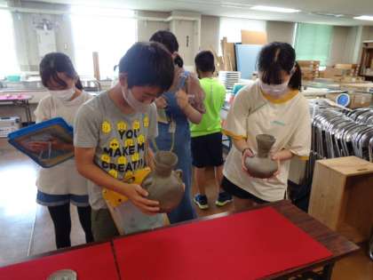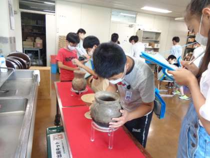 画像は、時代別の出土品を実際に手にして学んでいるところです。