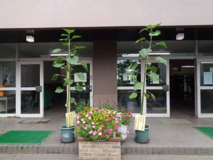 今年も市の保護司会の皆さまが、大きなひまわりを児童玄関に展示してくださいました。夏の日差しを浴びてこのあと、大輪を開かせそうです。長岡っ子の心も明るくしてくれそうです!