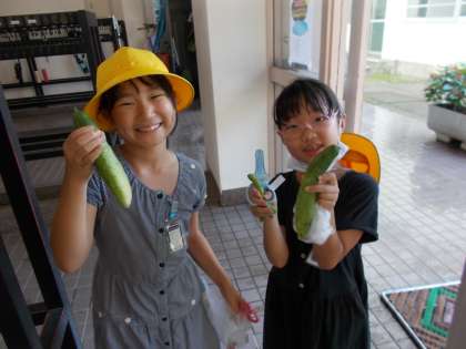 岡童農園の肥沃な土と、2年生の愛情たっぷりのお世話のおかげで、今日もたくさんの野菜が収穫できました。