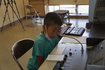 あいさつが上手だった人に配られる情報委員会体験カードを使って、お昼の校内放送を体験しました。