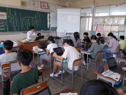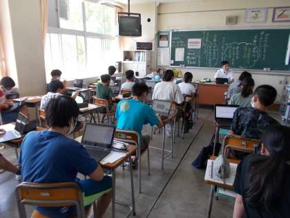 6年生は、chromebookのスライドを使い、夏休みの思い出の俳句作りをしていました。5年生教室の前には、子供たちが自主的に取り組んできた作品や研究・展示が掲示されていました。