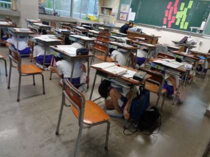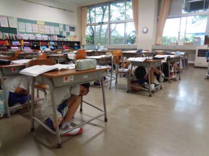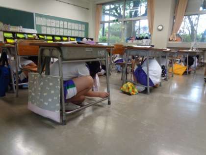 緊急の警報に合わせて、素早く身を守る練習をしました。