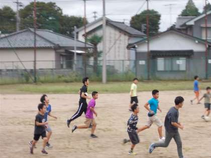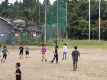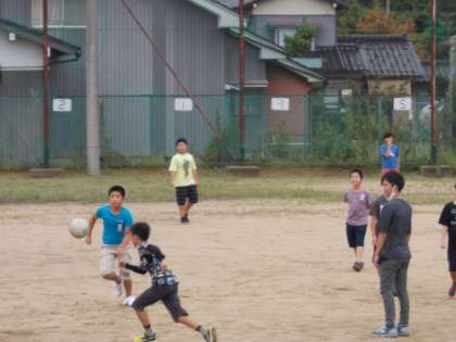 担任や教育実習の先生と一緒にサッカーで盛り上がる6年生。