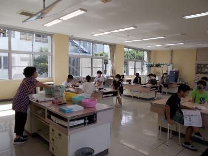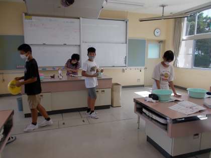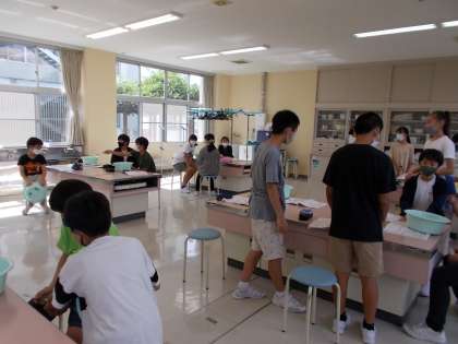 洗濯実習の準備中。洗い桶が配られただけで、嬉しそうな子供たちです。