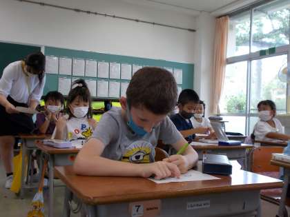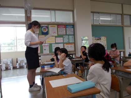 午前中の水遊びを振り返り、日記を書きました。「○○さんと水をかける勝負をして楽しかったです。」「先生にたくさん水をかけたのが楽しかったです。」など、活動を通して友達や先生と関わるよさを味わったことが伝わってきました。