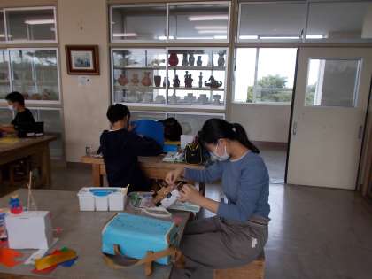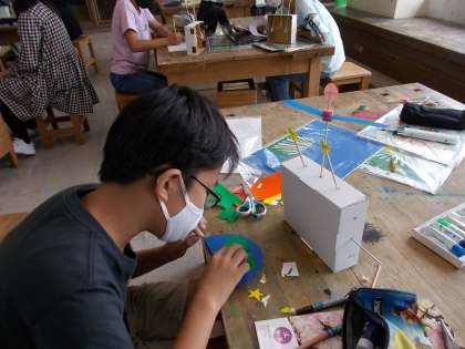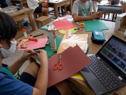 クランクの仕組みを生かした作品作りに取り組んでいます。サーフィンや一輪車をするピエロ等、動きから発想を広げる子供たち。完成が楽しみです。