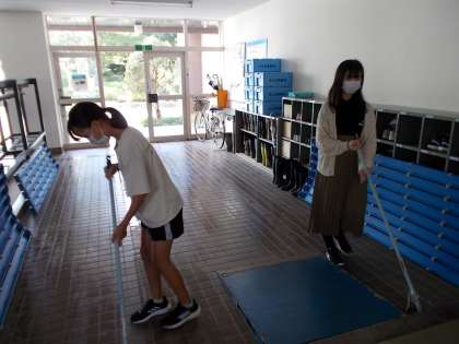 学年ごとに割り当てられた場所を掃除しています。学校の顔である児童玄関と正面玄関は、6年生が担当しています。