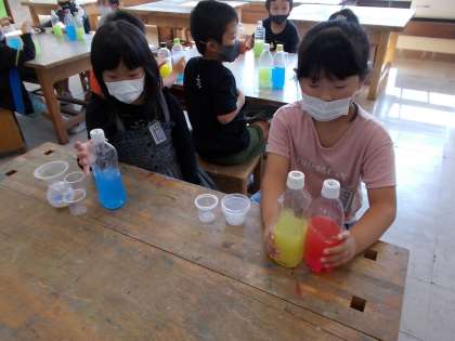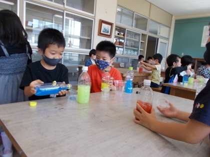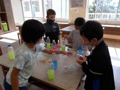 「イチゴミルクみたい!」「赤に青をちょっとだけたしたら、きれいな赤紫になったよ!」「あずき色だ!」みんなとても楽しそうです。