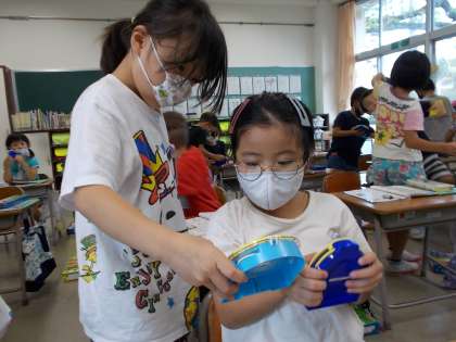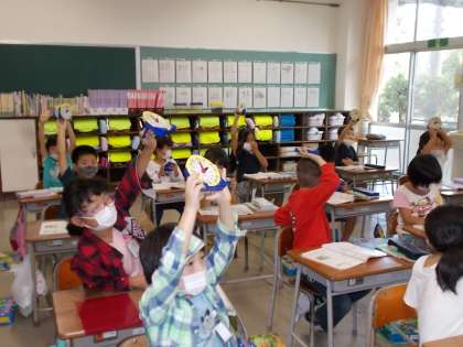 「○時!」「○時半!」という担任の声を聞き、時計の教具の針を合わせる子供たち。「半」が難しいようですが、教え合ったり、確かめ合ったりしながら取り組んでいました。