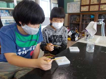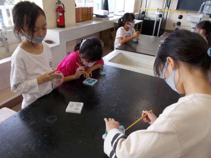 科学・工作クラブでは、石けん作りに取り組んでいました。綺麗な色のついたもの、ラメが入ったもの等、どれも輝く宝石のようでした。