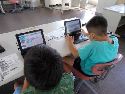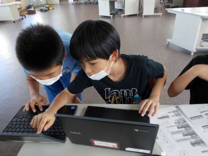 コンピュータクラブの子供たちは、プログラミングに挑戦中。キャラクターがかくれんぼをするプログラムを組んでいました。