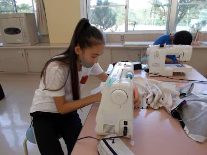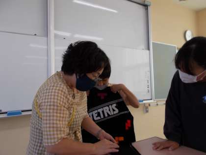 初めてのエプロン作りに奮闘中。分からないところは教え合い、協力しながら頑張っています。