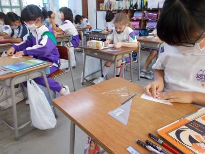 角の大きさや辺の長さを真剣に調べていた子供たち。授業が終わる時刻になると、「ええっ、もう終わり?!」「早かった!」との声が聞かれました。