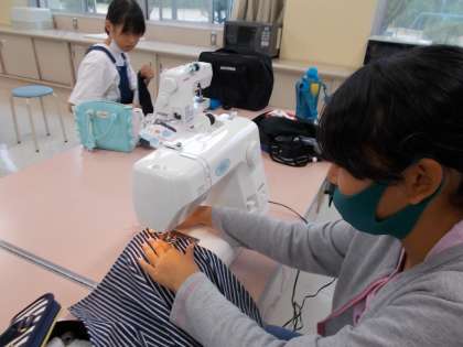 ミシンを使ってのエプロン作り。ミシンの扱いにも随分と慣れてきたようです。
