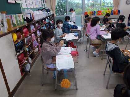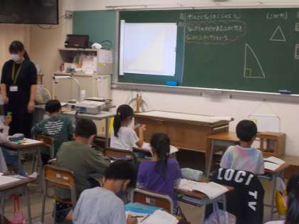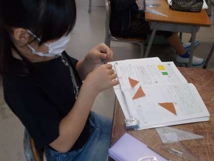 三角形の学習をしています。折り紙等の具体物を使いながら、角やへんについて調べました。
