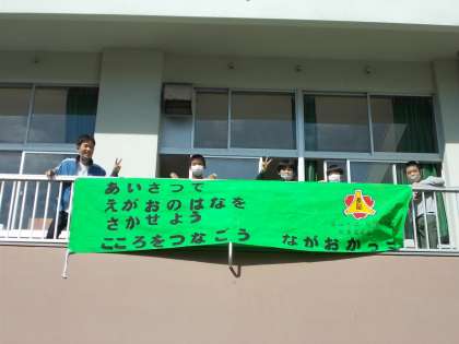 児童会のスローガンが書かれた横断幕を掲げました。毎朝登校時に目にすることで、一人一人が意識できるようになるとよいですね。