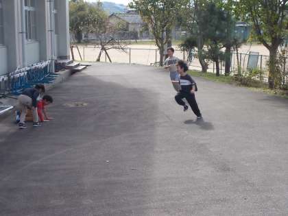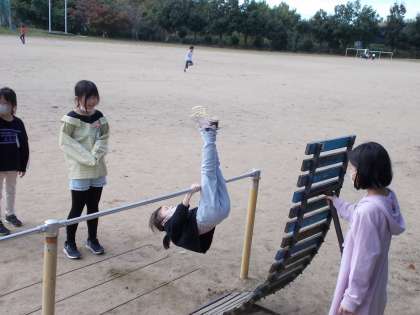 さわやかな秋空の下、外で元気に遊ぶ子供たち。長岡小学校らしい光景です。