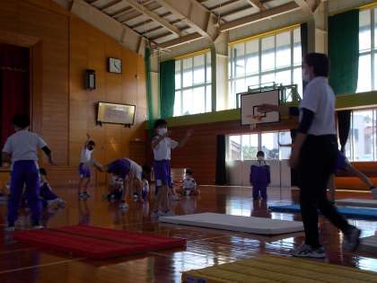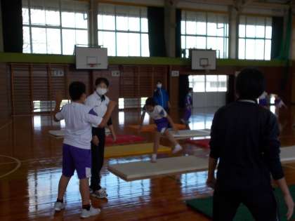 側方倒立回転、前転、後転を中心に指導していただきました。「難しい!」と言いながらも、教えていただいたことを意識しながら頑張っていました。