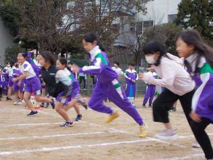 ジャベボール投げやラダー、鉄棒ぶら下がり等のメニューをローテーションで行っています。色々な運動に親しみながら、体力の向上を目指す長岡っ子です。