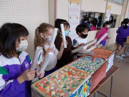 一人一人がつくったリズムをつないで、グループのリズムをつくりました。リズムをつなぐ順番を入れ替えたり、重ねる人数を変えたり、試しては話し合い、試しては話し合い…何度もくり返す中で、自分たちの好きなリズムやイメージに合ったリズムを見付けることができました。
