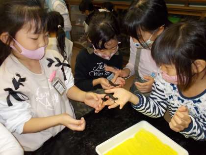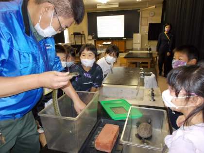 「牙がある!」「ざらざらした!」など、生き物と実際にふれあうことで、たくさんのことに気付いた子供たち。大変貴重な体験をさせていただきました。