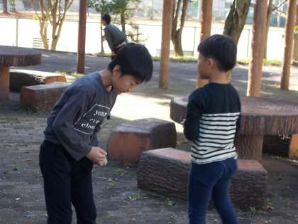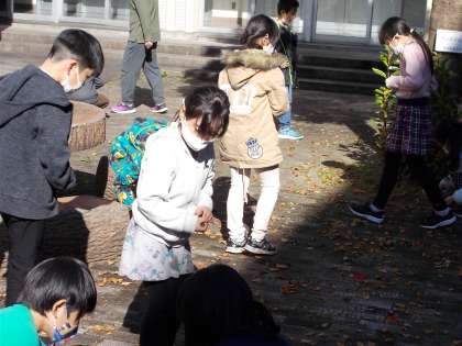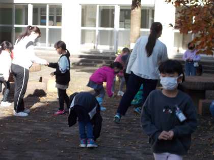 環境委員会が企画した「集まれ!どんぐり宝探し」。今日は、2年生と5年生が参加しました。ところどころ温かな日差しが降り注ぐ中庭でのどんぐり拾いはとても楽しそうでした。