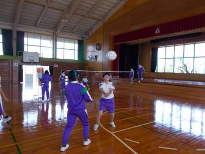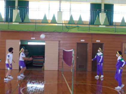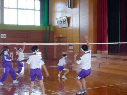 キャッチバレーボールをしています。Chromebookを活用して、チームの課題分析もしていました。さすが6年生です。