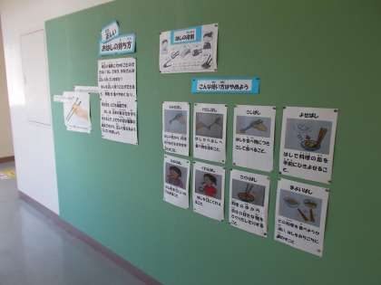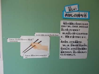 体育館渡り廊下に、箸の持ち方についての掲示がされています。正しい持ち方で、美しく食事ができるようになるとよいですね。