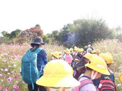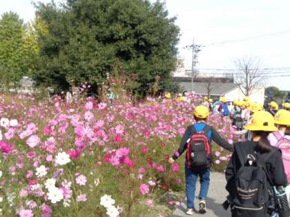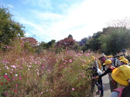 緑化植物園内には、秋の草花が咲いていました。見頃は過ぎましたが、コスモスの群生している場所がありました。秋の陽差しに映えて、色とりどりに輝いて見えました。