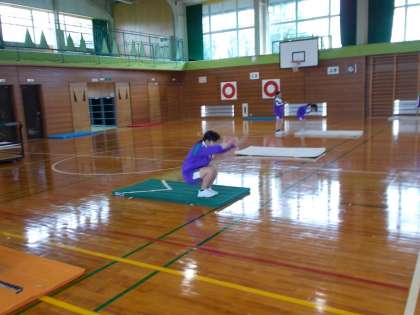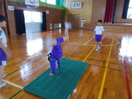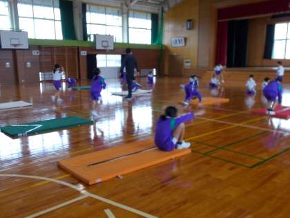 マット運動に取り組んでいます。前転や側方倒立回転が美しくできるようになってきました。