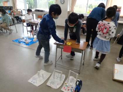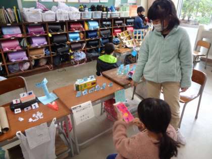 「動くおもちゃランド」が完成し、今日は1年生を招待してみんなで遊びました。教室のあちこちでたくさんの笑顔があふれていました。