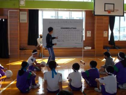 体育科「キャッチバレーボール」の学習です。色団ごとに作戦を考え、ゲームに臨みました。球技が大好きな6年生。今日も大盛り上がりでした。