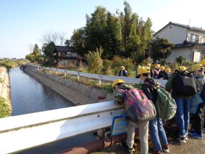 秋晴れの下、校区付近の史跡や歴史をたどる学習に出かけました。古の人々の願いを叶えた「牛ヶ首用水」の伝説や完成に至るまでの苦労等について、牛ヶ首土地改良区の皆様に教えていだきました。当時の作業の大変さが伝わりました。