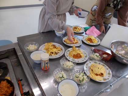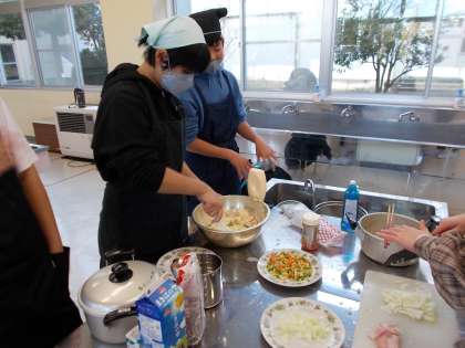 調理実習の様子です。今日のメニューは、オムライス、コーンスープ、ポテトサラダ。グループで協力して、手際よく調理していました。
