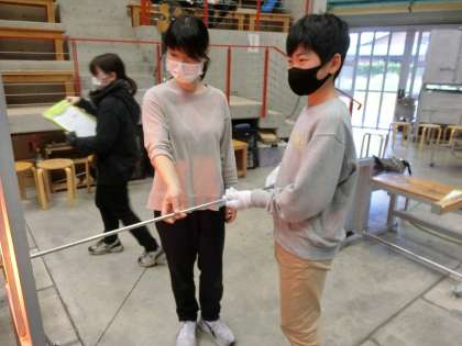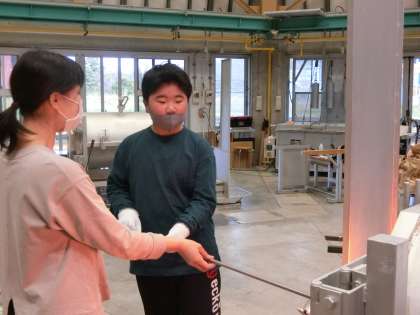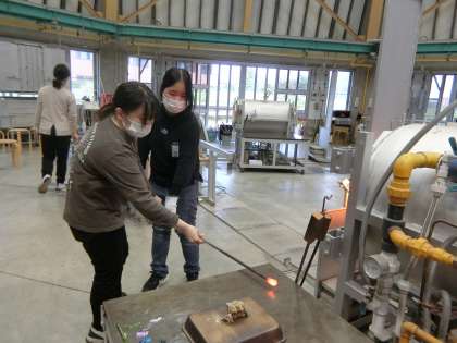 溶けたガラスを棒に巻き付けて、ゆっくりと回しながら、色つきのガラスを入れていきました。