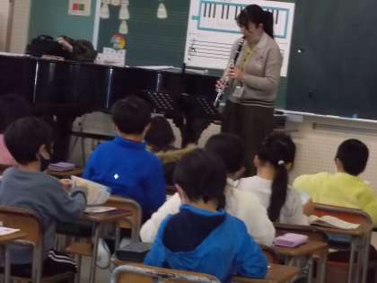鑑賞する曲に出てくる楽器の一つ、クラリネットを担任自らが演奏し、紹介しました。「さんぽ」の演奏に合わせて、歌ったり手拍子を打ったりして、みんなとても楽しそうでした。
