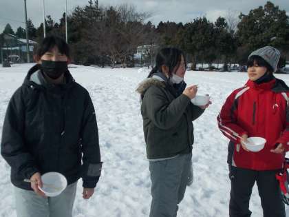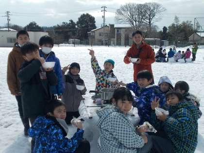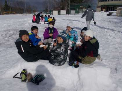招待された6年生もとても嬉しそうでした。昼からは3学年一緒に雪上ゲームや雪遊びをします。