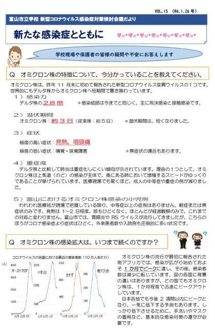 富山市教育委員会より、「新型コロナウイルス感染症対策検討会議だよりVoL.15」が届きましたので、本日印刷したものを配付するほか、データは右の「配布文書」欄に掲載します。ご確認ください。