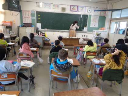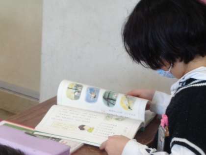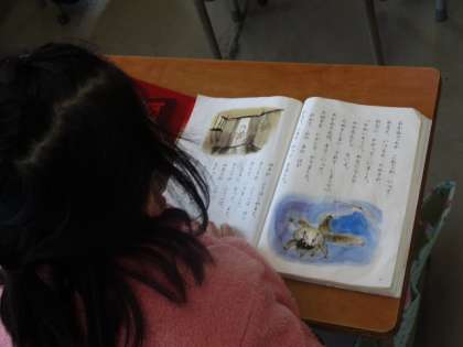 「たぬきの糸車」の学習をしています。担任の先生から「心に残る一文を見つけましょう。」と課題が出されました。みんな真剣に物語に向き合って探しています。