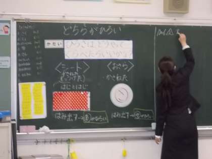 「どちらがひろい」の学習をしました。レジャーシートの広さを比べるときには、重ねてみるとよいことが分かりました。